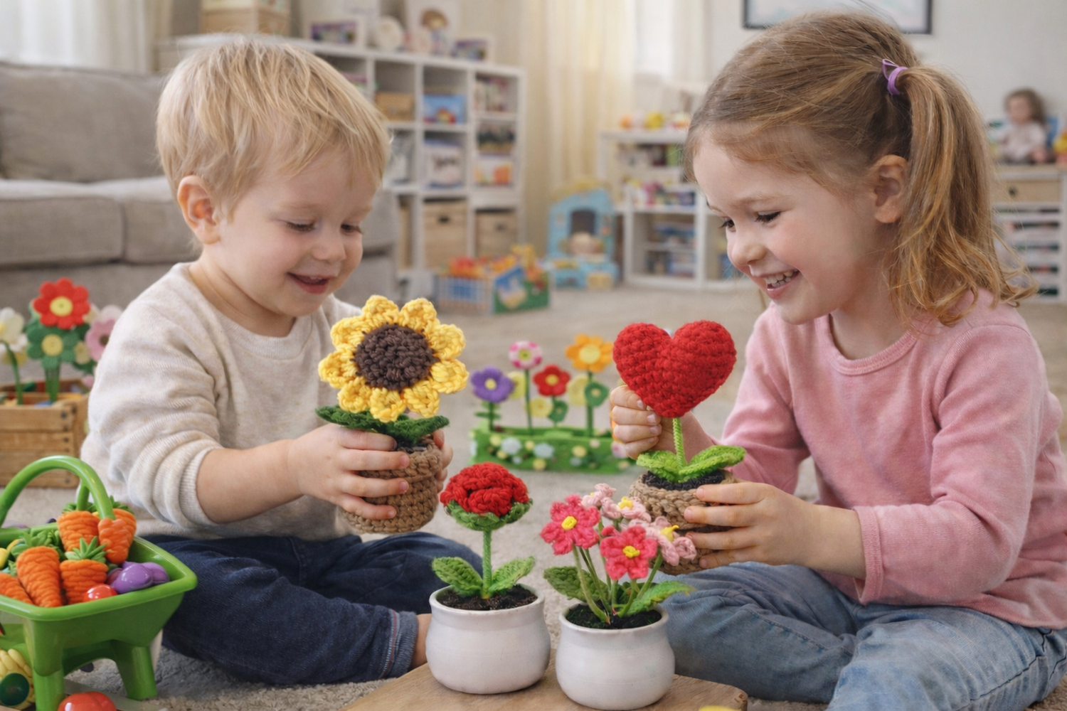 Soft yarn textures and charming details give each bloom a cozy, gift-worthy feel.